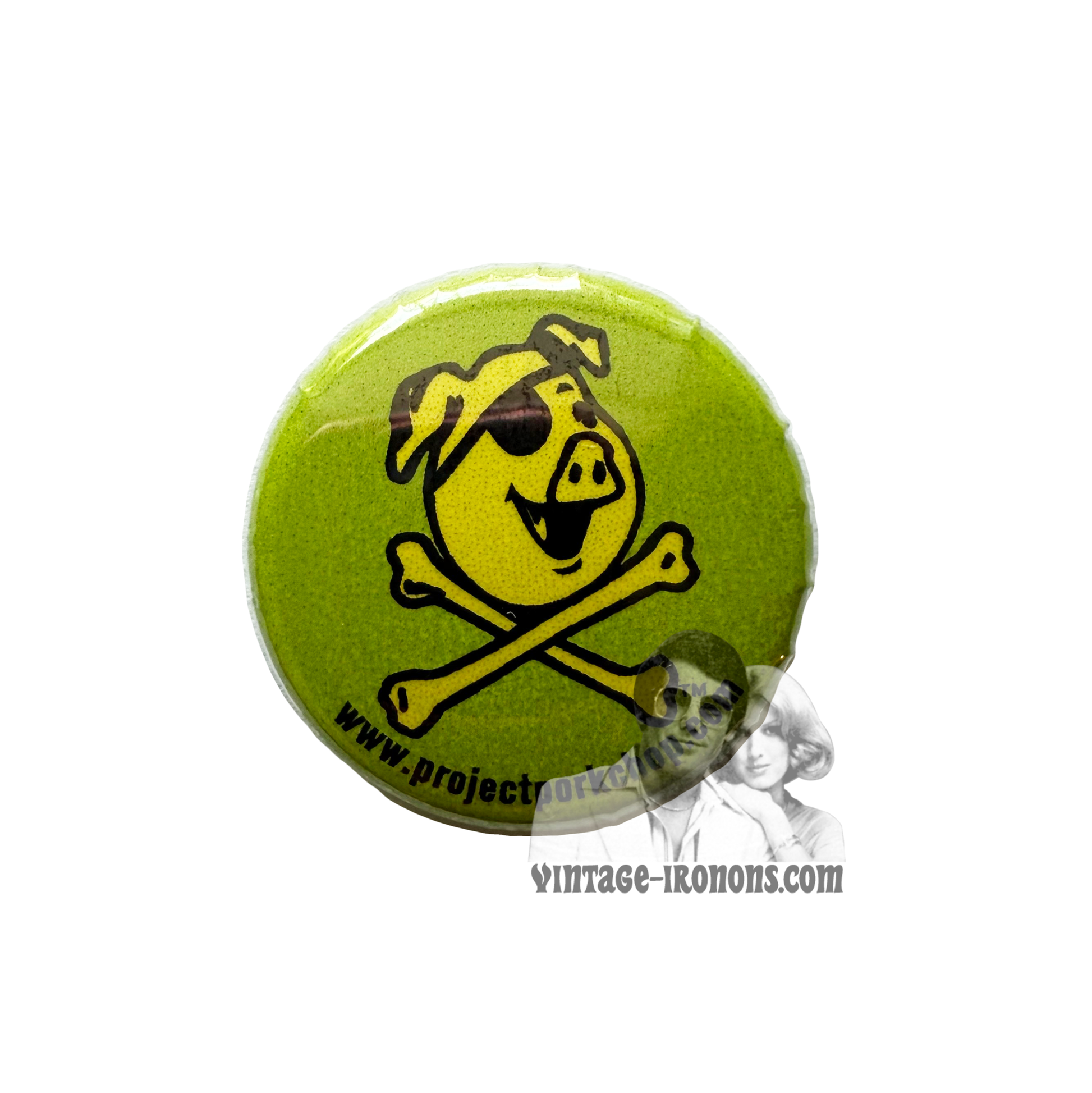 Project: Porkchop pea green button with pirate pig and crossbones logo.